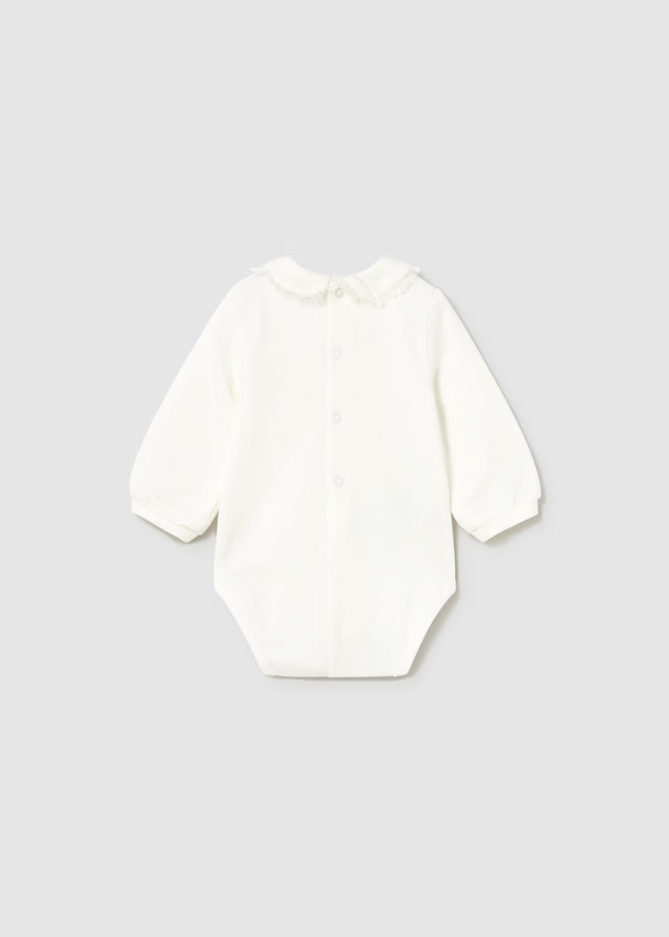 A matching long-sleeve bodysuit with snap-fastenings at the crotch and a back closure for easy dressing.