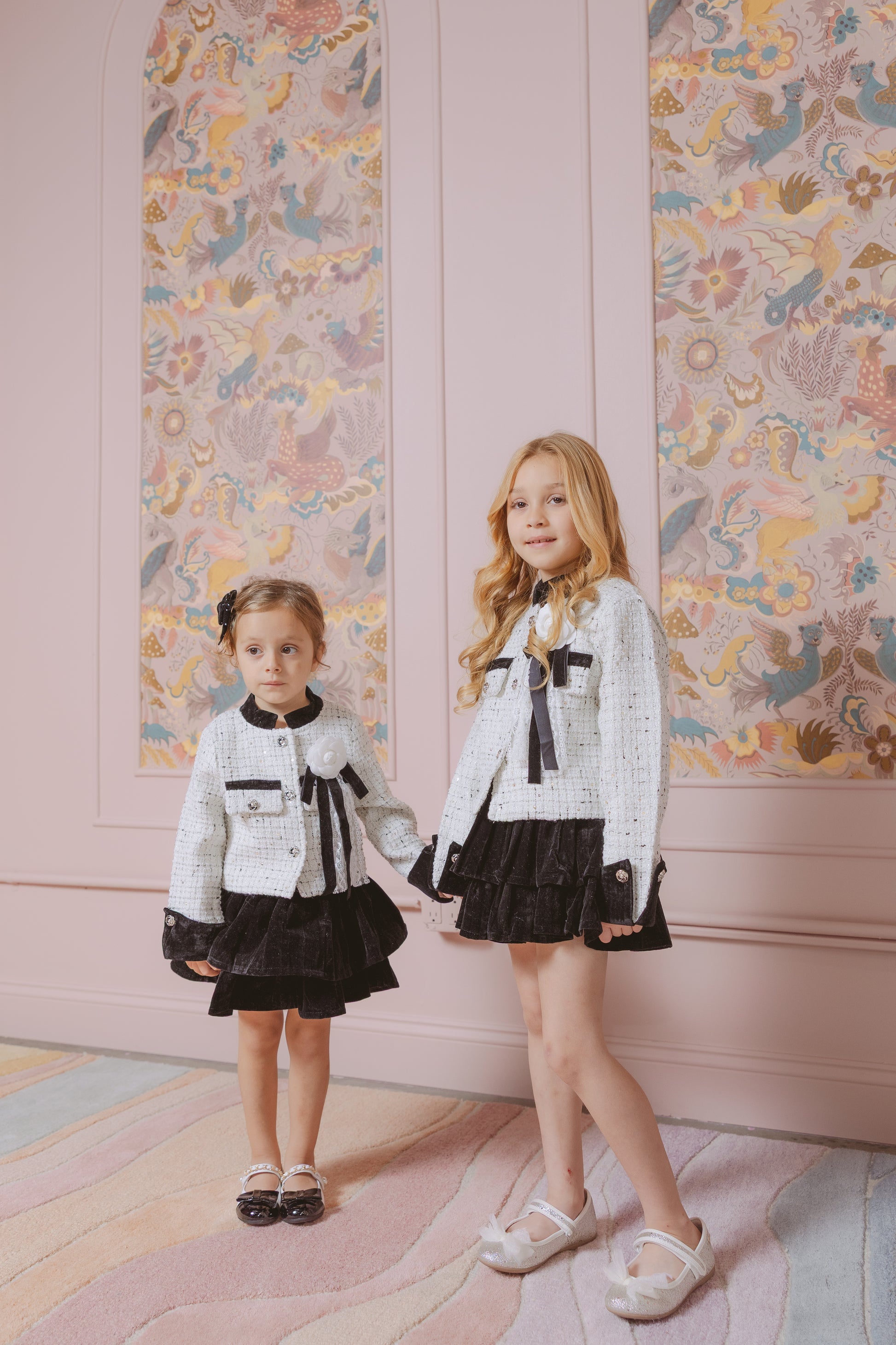 The Alba Set by Tina Mur is a timeless and elegant outfit for girls, designed to make every special moment unforgettable. This two-piece set features a soft velvet skirt paired with a classic Chanel-inspired tweed jacket, creating a chic and stylish look that’s perfect for birthdays, weddings, holidays, and family photos. Available in sizes 1 year to 14 years, the Alba Set offers a beautiful fit for toddlers, little girls, and teens alike.