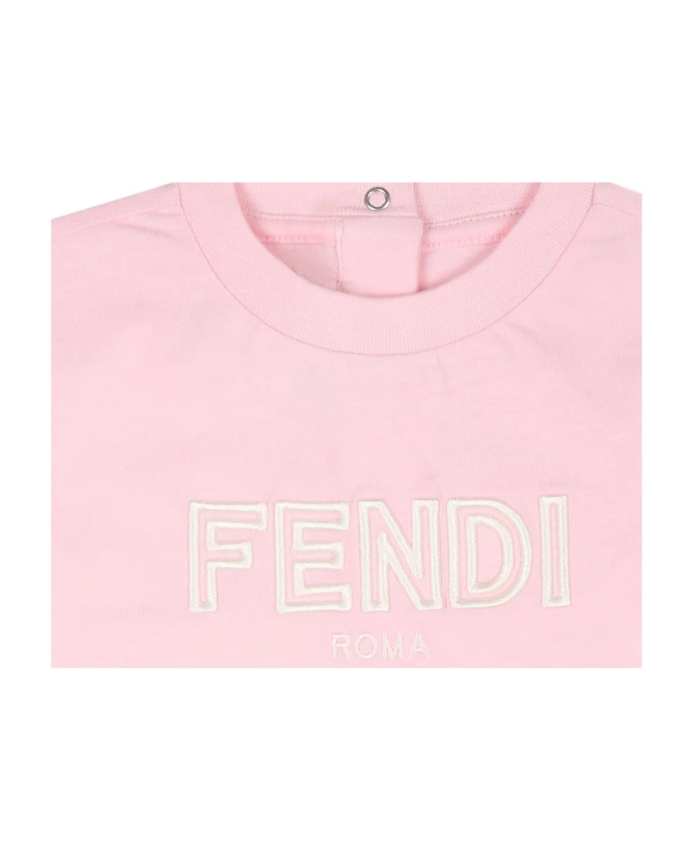 Pink t-shirt from the luxury brand Fendi Kids, made of soft cotton jersey. It features short sleeves, a ribbed crew neck and a snap button closure at the back for a comfortable fit. It is embellished with the Fendi Roma logo embroidered on the front.