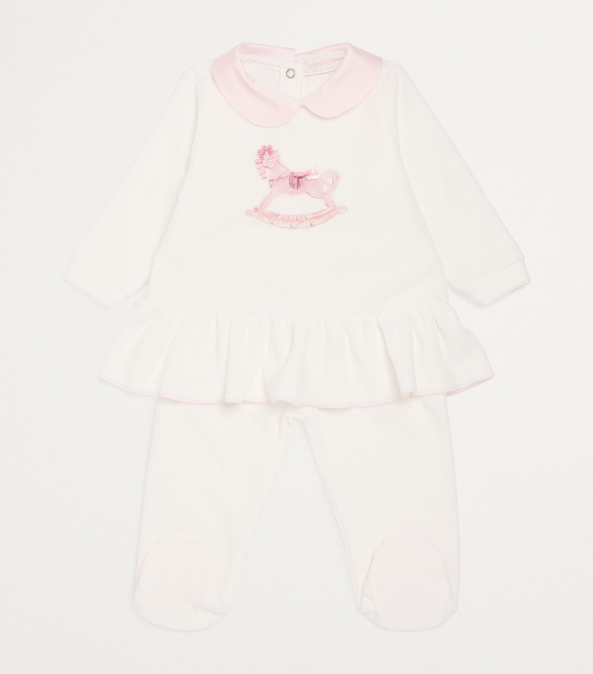 Crafted from a soft and comfortable cotton blend, this top and leggings set from Bimbalo make an endearing playtime ensemble. Complete with a smart collar and ruffled hem, the top presents your little one with a charming new toy: an elegant rocking horse donning delicate embellishments and crystals.