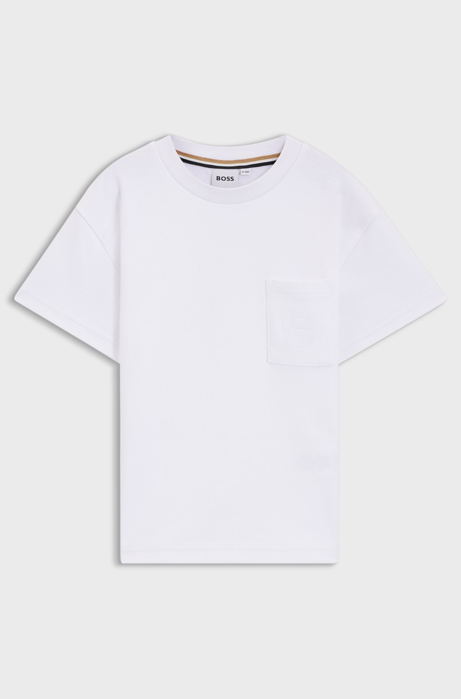 Elevate his everyday style with this loose-fit cotton T-shirt from BOSS, featuring a subtle Double B monogram embroidered on the chest pocket. Crafted from 100% soft cotton, this shirt offers breathable comfort for all-day wear. The relaxed silhouette allows easy movement, making it perfect for school, casual outings, or layering under jackets or hoodies. A woven logo label adds a refined finishing touch.