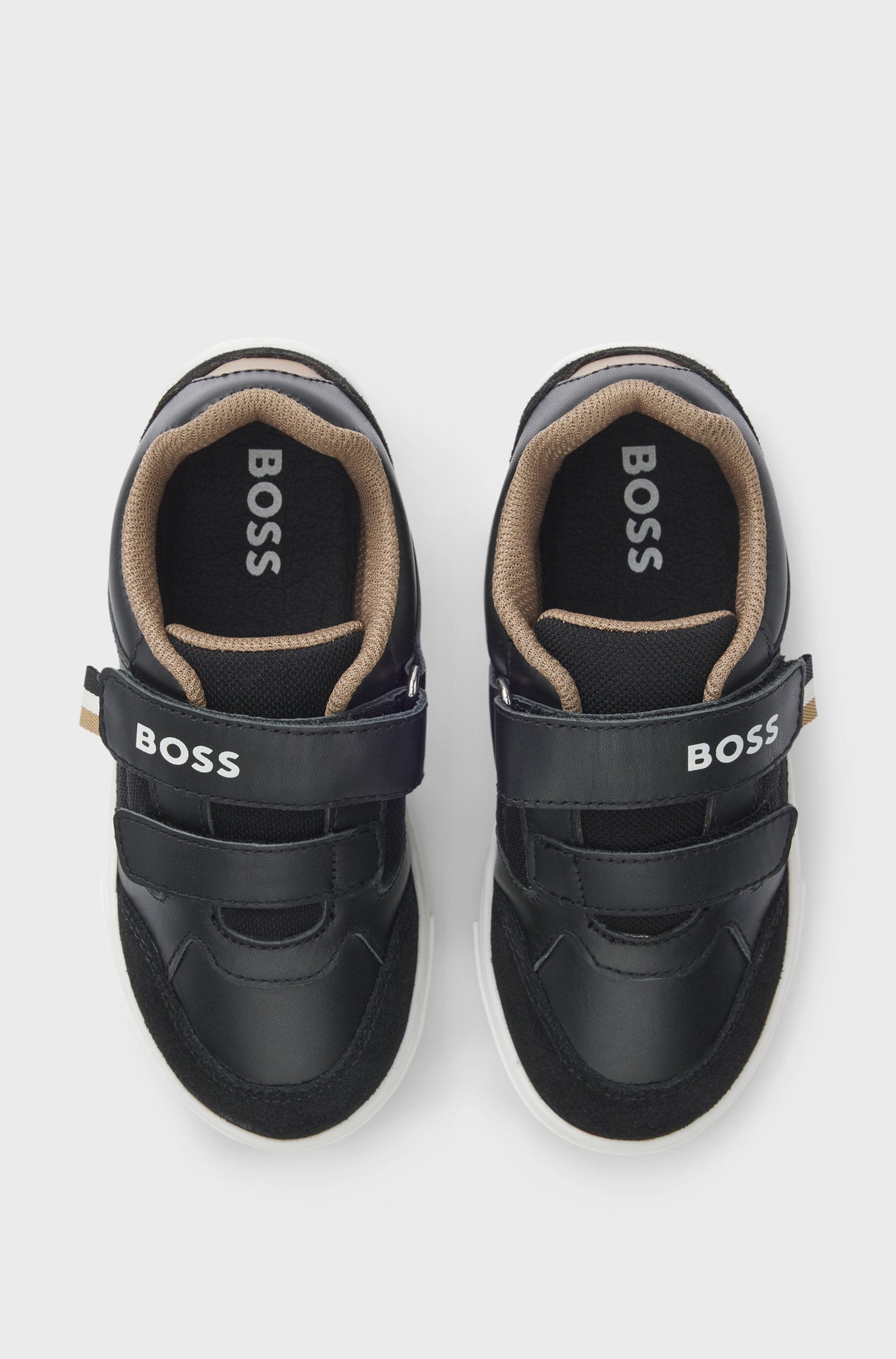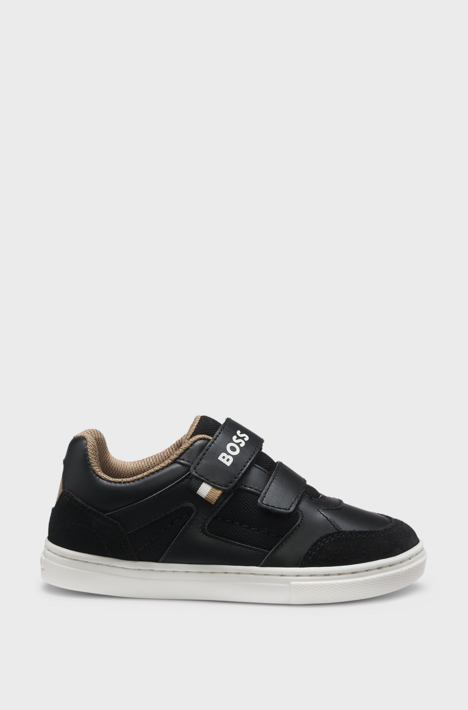 Step up his shoe game with these sleek black leather low-top trainers by BOSS. Crafted from premium leather, they combine durability with modern style. The minimal logo detailing gives them an elevated edge that works well with joggers, jeans, or smart casual wear. With a comfortable silhouette, these trainers are ideal for everyday use, school, or weekend activities.